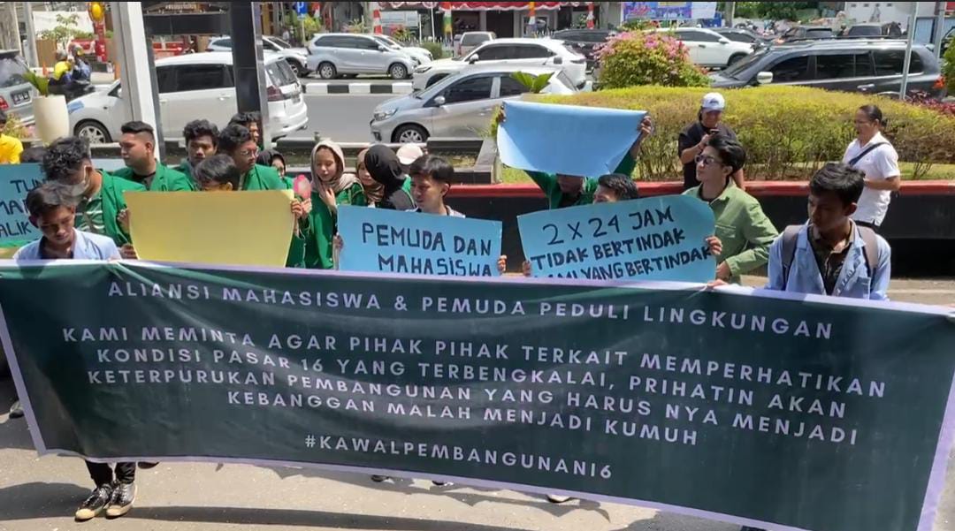 Palembang-Puluhan Massa dari pemuda Aliansi mahasiswa peduli lingkungan melakukan aksi damai di kantor Wali Kota Palembang, Terkait permasalahan pasal 16 Palembang