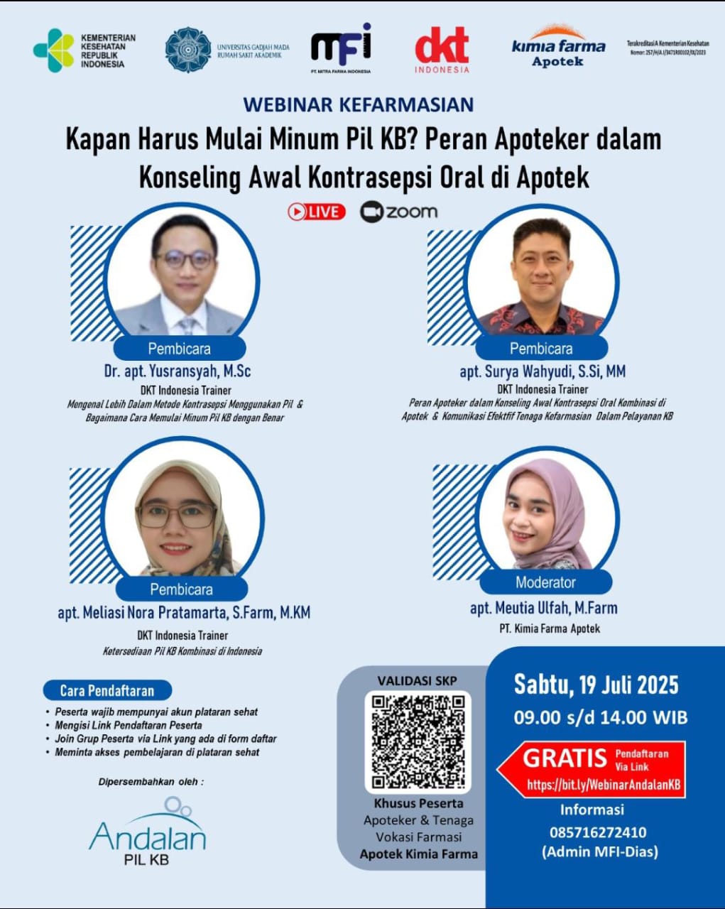 Acara yang diikuti lebih dari 600 peserta dari kalangan apoteker dan tenaga kesehatan ini berlangsung secara daring melalui platform Zoom dan live streaming YouTube. Webinar ini merupakan bagian dari upaya berkelanjutan untuk meningkatkan pemahaman tenaga farmasi tentang edukasi kontrasepsi yang aman, akurat, dan berbasis bukti ilmiah, terutama pada layanan lini pertama seperti apotek.