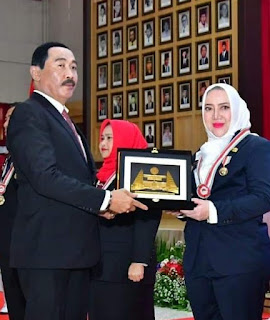MUSI RAWAS-Bupati Musirawas, Hj Ratna Machmud menerima Penganugerahan Kartika Pamong Praja Muda dan Lencana Alumni Kehormatan Pendidikan Tinggi Kepamongprajaan.