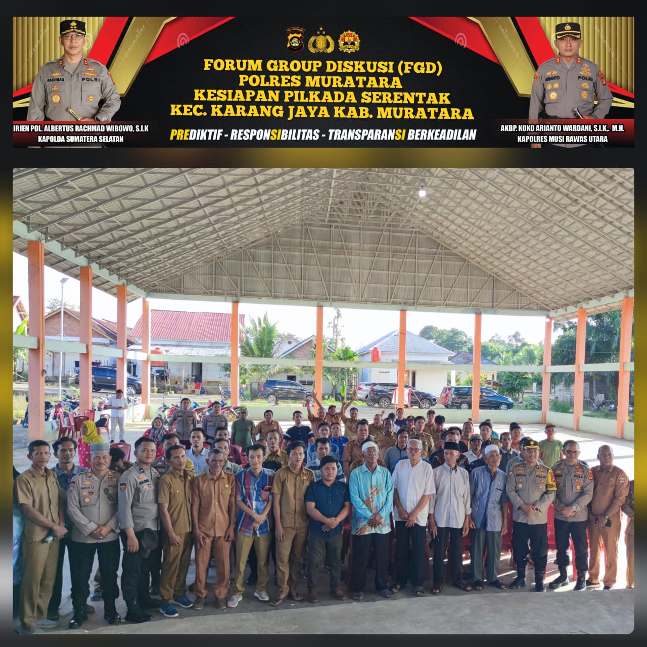 KARANG JAYA-Dalam rangka Kesiapan menghadapi Pilkada Serentak Kabupaten Musi Rawas Utara (Muratara) tahun 2024, Polres Muratara adakan Forum Group Diskusi (FGD). Kegiatan dipusatkan di Gedung Serbaguna Desa Terusan Kecamatan Karang Jaya, Kabupaten Muratara, Senin, 3 Juni 2024 Pukul 14.00 WIB