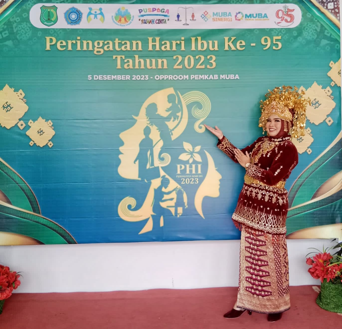 Muba– Kenakan pakaian adat 17 kabupaten/kota se Sumatera Selatan, Dharma Wanita Perwakilan dari OPD di lingkungan Pemkab Musi Banyuasin tampak tampil sangat percaya diri dengan isi Senjang yang dibawakan berhasil menghibur para tamu undangan yang hadir dalam rangka menyemarakkan puncak peringatan Hari Ibu (PHI) ke-95 di Opproom Pemkab Muba, Selasa (05/12/2023) siang.