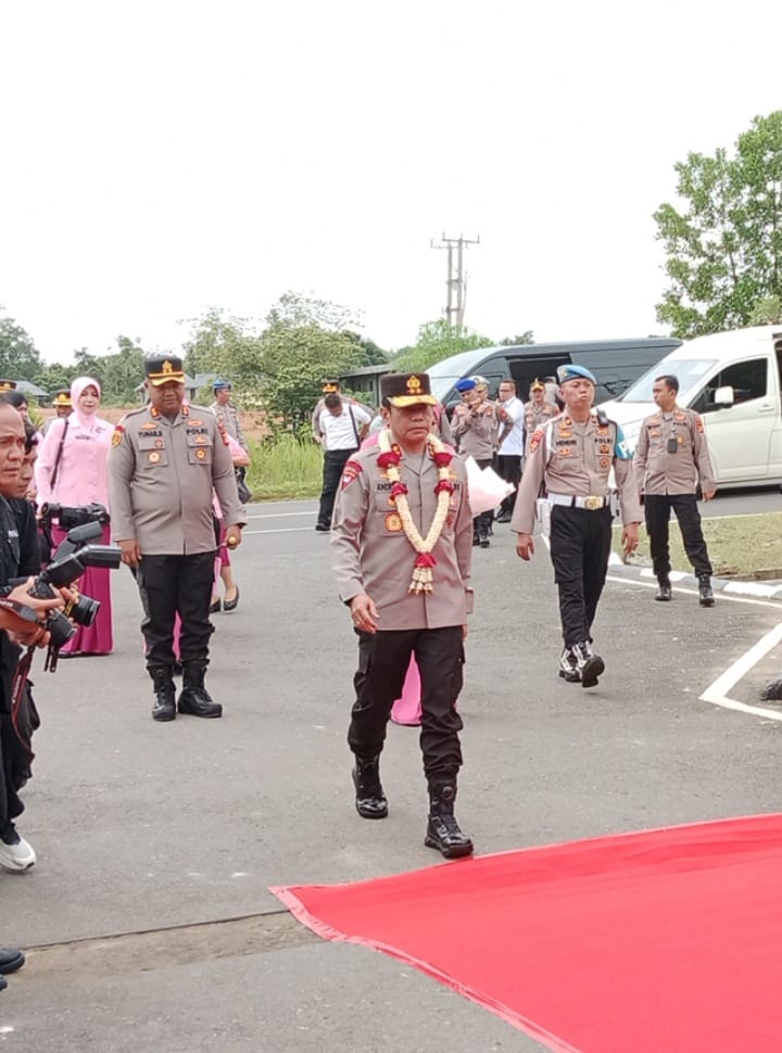Acara yang berlangsung khidmat ini,diawali dengan acara penyambutan dengan pengalungan bunga dan tarian Serepat Serasan dihalaman depan pintu gerbang Mako Polres PALI.