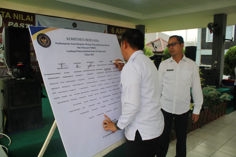 BANYUASIN, ,- Lembaga Pemasyarakatan (Lapas) Kelas IIA Banyuasin melakukan Penandatanganan Pakta Integritas, Perjanjian Kinerja dan Komitmen Bersama Pembangunan Zona Integritas Menuju Wilayah Bebas dari Korupsi (WBK) dan WIlayah Birokrasi Bersih dan Melayani (WBBM), Rabu (22/1).