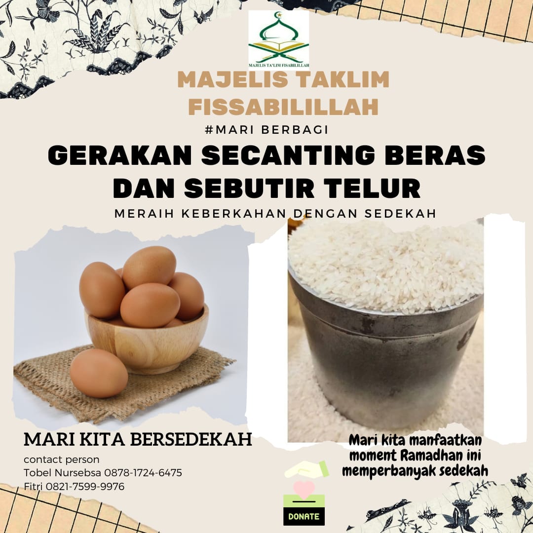 Seperti dikatakan Ketua Majelis Ta’lim Fissabilillah Tobel Nursebsa, M. Pd melalui Sekretaris Vera Herawati didampingi humas Fitri, MM kepada wartawan ini, mengucapkan banyak terimakasih pada warga komplek perumahan green garden yang antusias menyambut gerakan sosial dengan tema “Secanting Beras dan Sebutir Telur”. Betapa tidak, warga yang ikut berpartisipasi tentunya tidak akan merasa berat hanya mengeluarkan sedekah secantik beras dan sebutir telur.