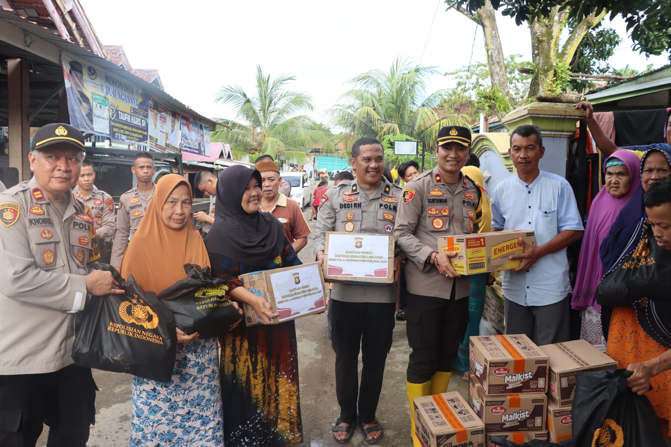 MURATARA-Kapolda Sumsel cepat tanggap menyalurkan bantuan paket sembako pada warga Muratara yang terdampak banjir.