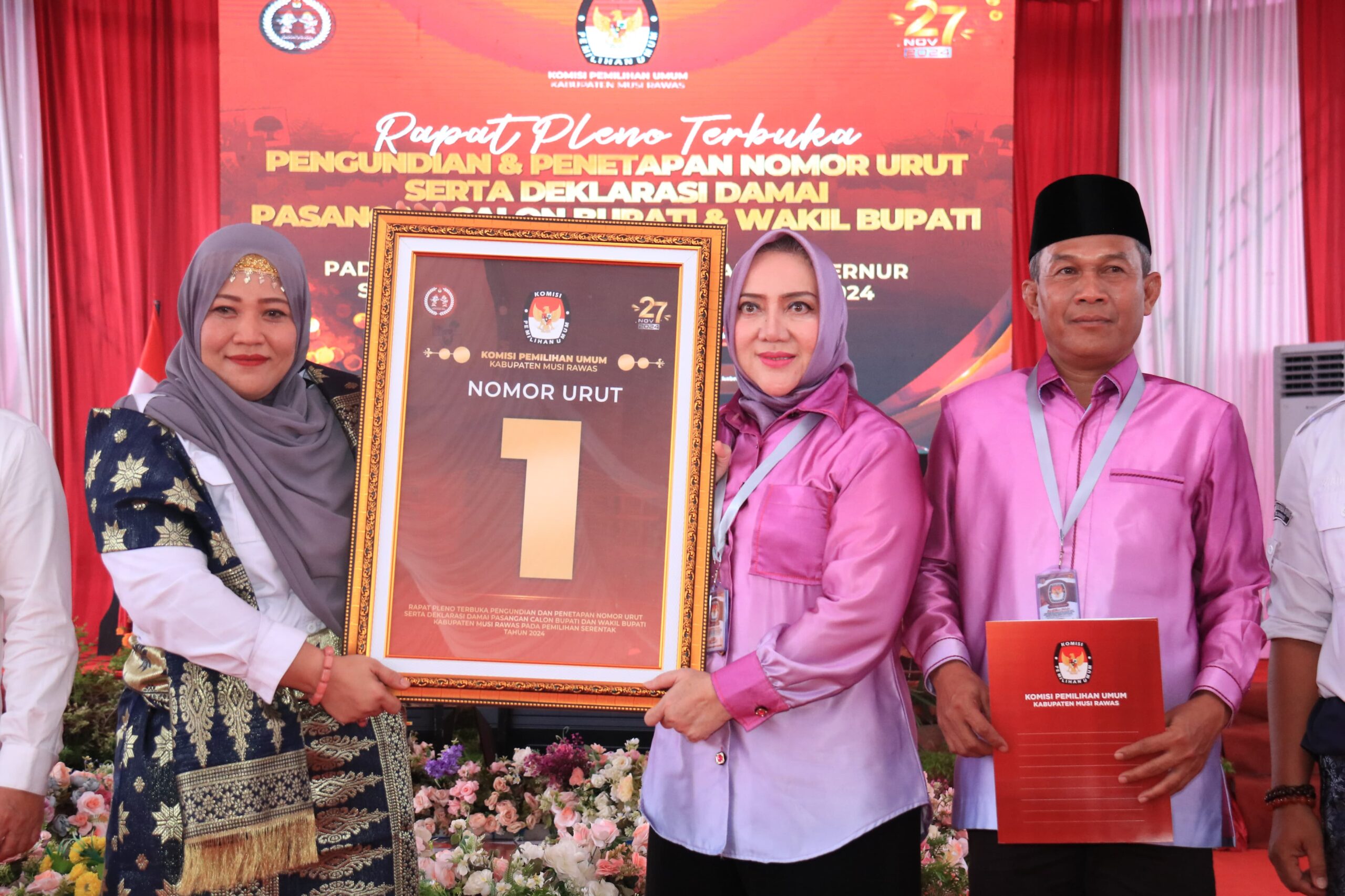 MUSI RAWAS – Komisi Pemilihan Umum (KPU) Kabupaten Musi Rawas menggelar rapat pleno terbuka pengundian dan penetapan nomor urut pasangan calon bupati-wakil bupati Musi Rawas di Kantor KPU Kabupaten Musi Rawas, Senin (23/9/2024).