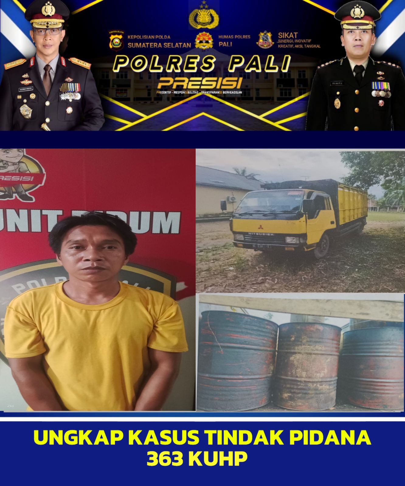 Diketahui adapun barang bukti yang diamankan polisi berupa 1 (satu) unit mobil truck merk mitshubishi warna kuning nopol BE 8084 PJ, dan 3 buah drum berisikan minyak mentah. (*)